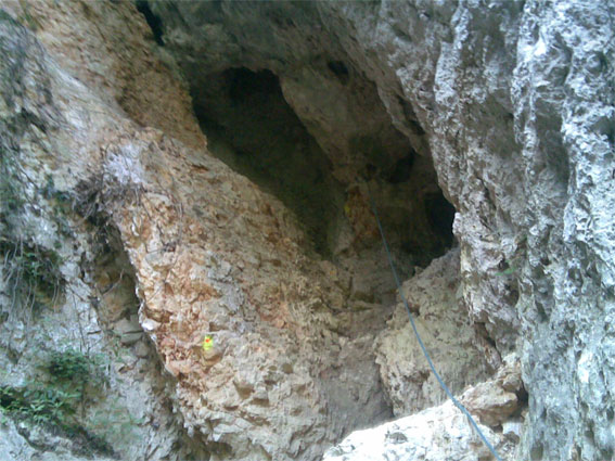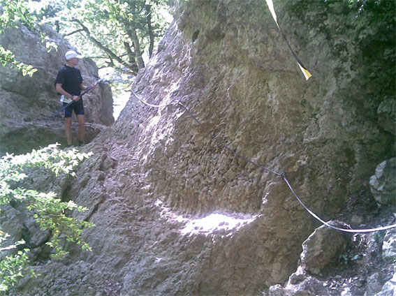 Ein weiterer Höhepunkt nach einem längeren, kräftezehrenden Aufstieg war ein drahtiger Helfer auf einem kleinen Felsabsatz, der mit einer drehenden Kopfbewegung schweigend nach oben wies. Es war aber kein Weg, sondern nur das Ende eines Stahlseiles zu erkennen, das irgendwo ins Nichts zu führen schien. Da es kein Zurück mehr gab, hieß es nur sich hoch zu ziehen und gut festzuhalten, um so den Weg fortzusetzen. Im weiteren Parcours waren am Felsen schräg verlaufende oder senkrecht befestigte Leitern fast ein Vergnügen. Später endete der Weg an einem Felsüberhang. Nur ein im Fels verankertes Stahlseil und ein Rettungsposten, der ein zusätzliches Sicherungsseil gespannt hatte, halfen über diese schwierige Stelle hinweg.
