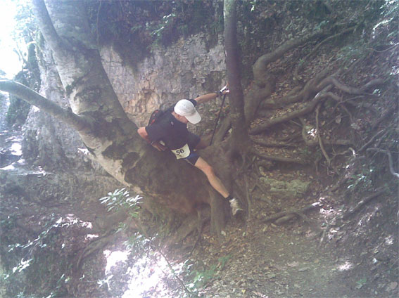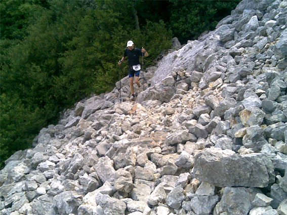 Bergab ging es ca. 500 m in einer Steinmoräne in die Schlucht hinab. Weitere Verpflegungsstellen waren bei km 27 und 37 aufgebaut. Getränke und feste Nahrung waren optimal, so dass kaum auf die eigene, vorgeschriebene Verpflegung zurückgegriffen werden musste. Im weiteren Verlauf der Strecke überwanden die zwei Westumer umgestürzte Bäume und massige Steine, wobei ihnen Brocken bis 50 cm zunehmend lästig, noch größere aber zur Qual wurden. Bergab waren die Stöcke eine unerlässliche Hilfe, um die Knie zu entlasten, in manchen Situationen aber auch hinderlich.